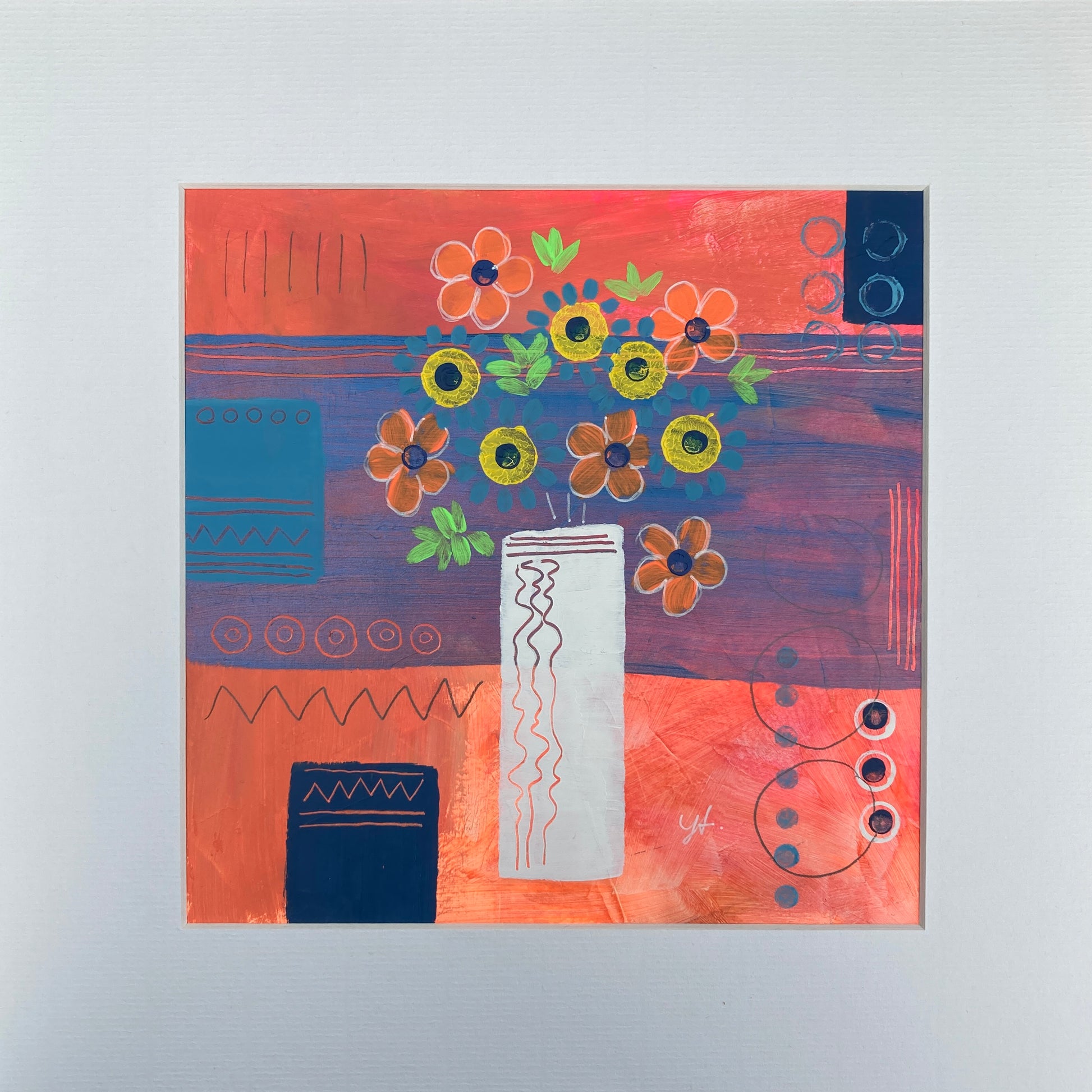 If you're looking for a bright vibrant painting to add a pop of colour into your home: maybe your living room is screaming for a focal point, or your bedroom wall is a little bare?, then this is the painting for you!  This painting will bring its combination of energetic colours, geometric pattern & the semi-abstract representation of a vase of flowers into your home, giving it a truly unique and original piece of artwork that stands out!