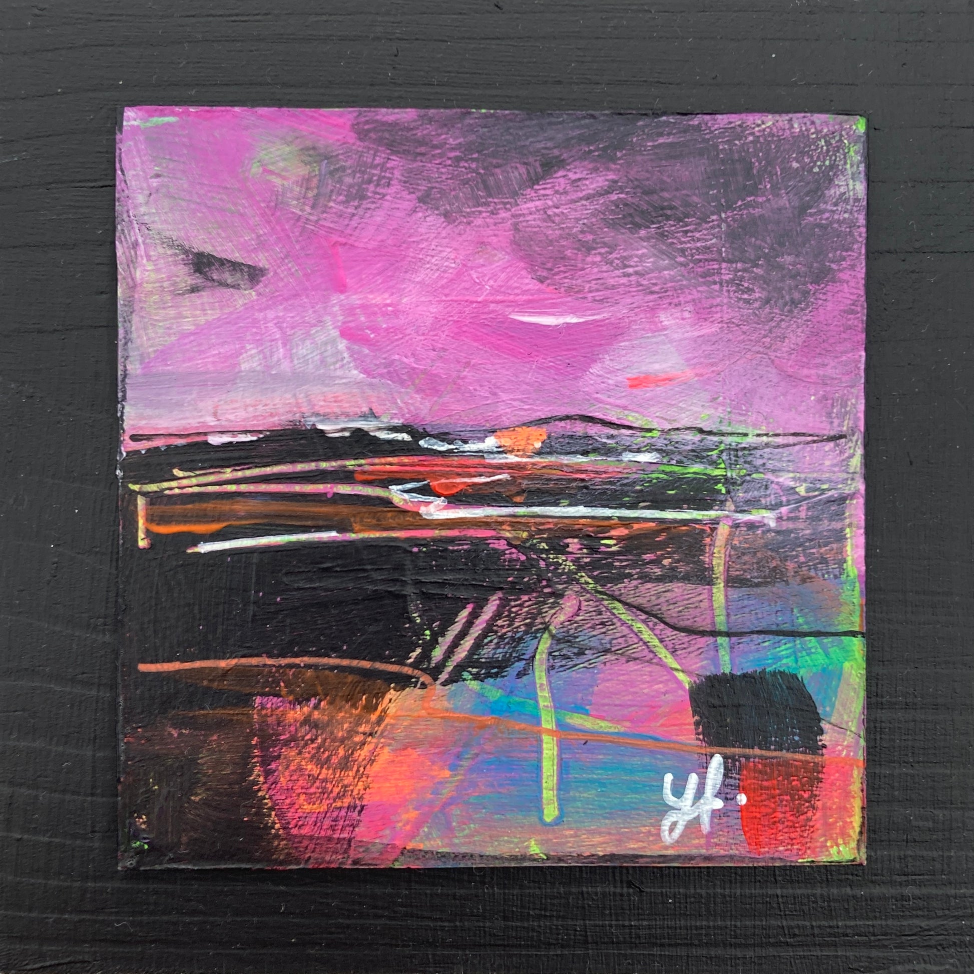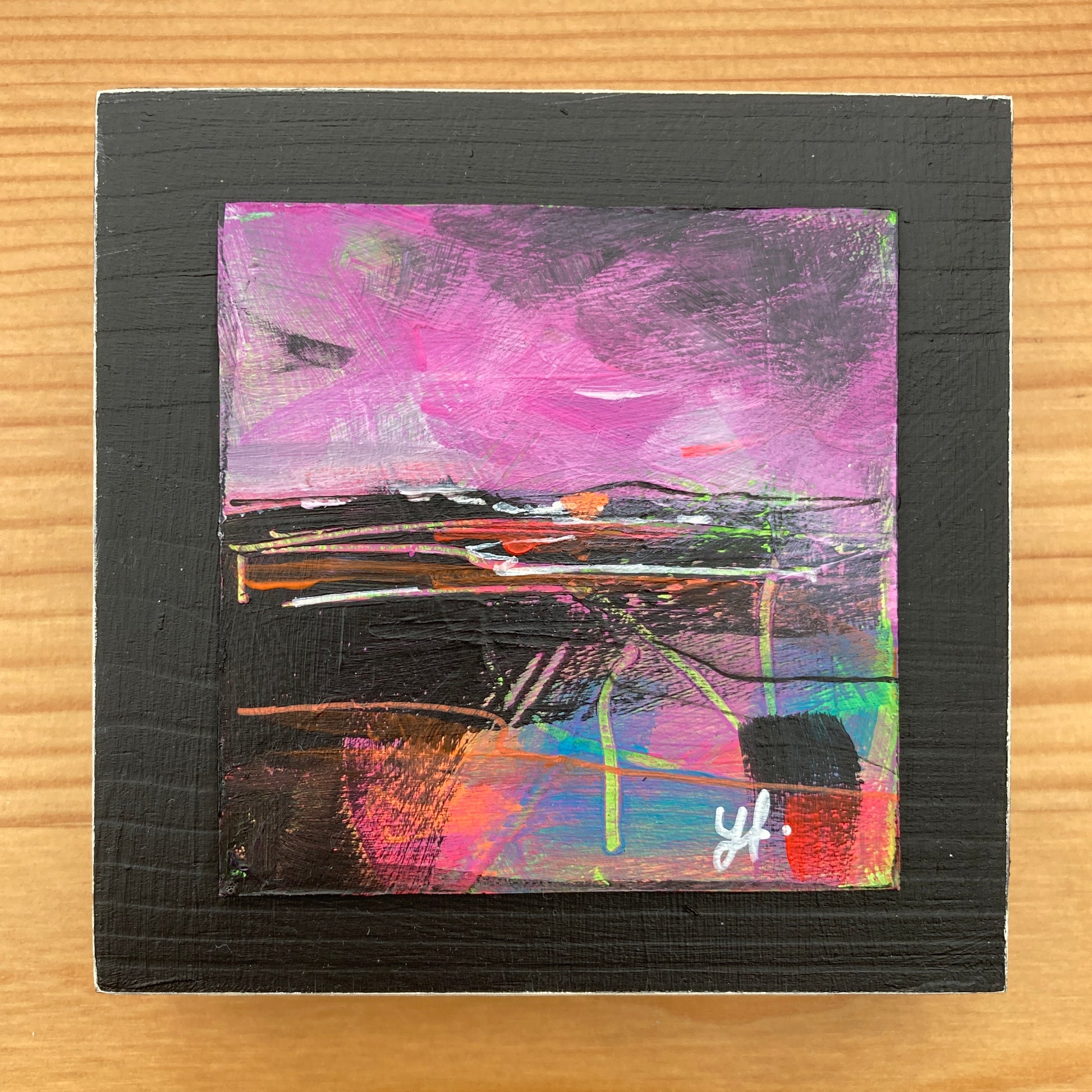 Patchwork Landscapes I is a small abstract landscape painting mounted on to a wooden block, created using a range of mixed media.