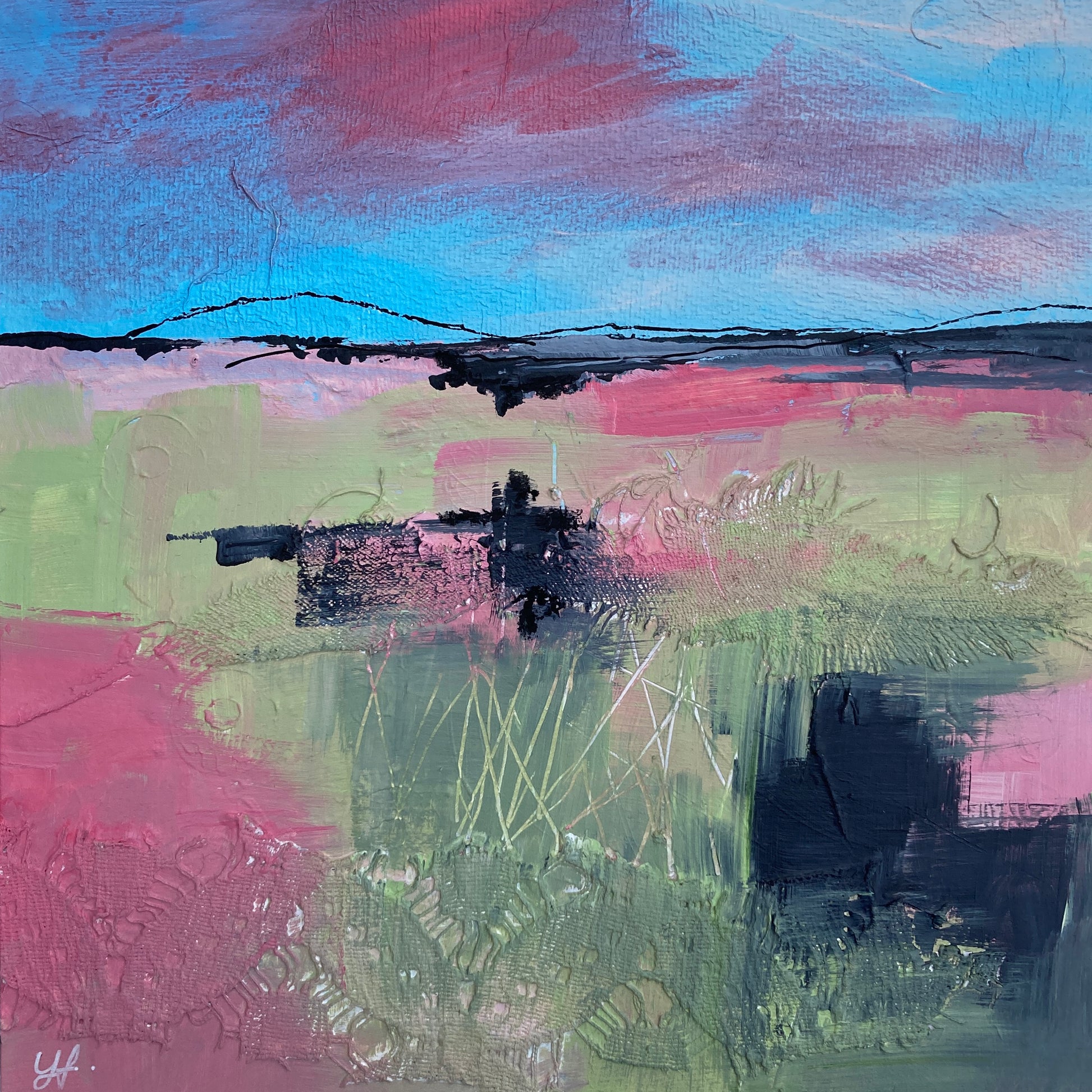 Soft Layers of paint have been used to keep the painting fresh. Pastel pinks give a sense of summer, and the pale shades of green have a calming effect. Texture has been introduced to the artwork by the addition of recycled fabrics and different types of marks have been made in the paint in order to help the viewer feel the grasses blowing in the gentle breeze. The rolling hills in the distance lead you on a journey into the picture and give the eye something new to discover.