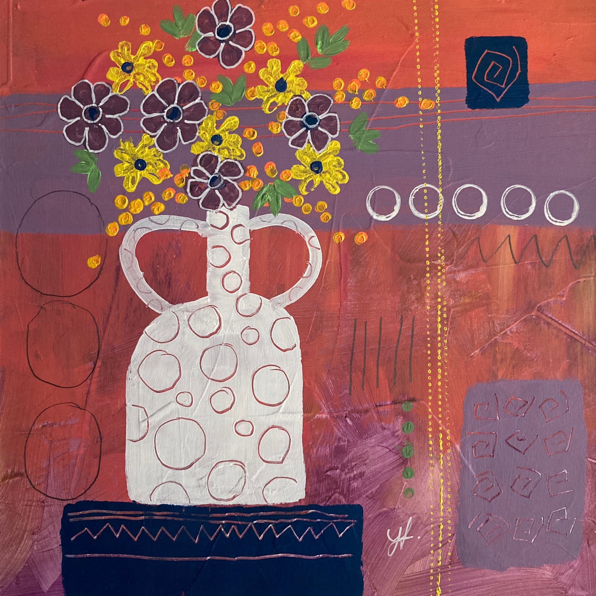 Spotty White Pot is a painting full of composition, colour and tone. The abstract background consists of strong zesty colours with bold expressive marks and shapes that give the artwork vivacity and will make an atmospheric focal point in your home. Simple mark making tools have been used to scratch different shapes into the paint and pencil has also been used to add an extra dimension to the painting. The white spotty pot brings the picture together giving balance and a focal point. The complementary coloured flowers have been created using homemade stamps, simple brush strokes and pen outline.